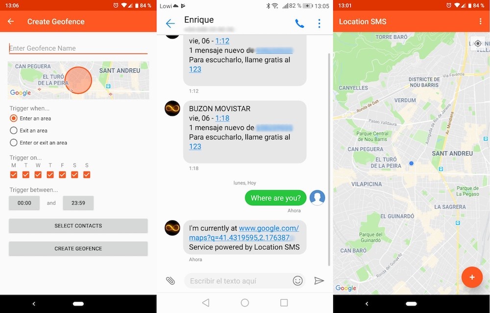 Otra opción interesante es la de 'Geofence'. Se trata de crear un área de seguridad y cada vez que entremos o salgamos se enviará un SMS automáticamente. La aplicación también deja establecer un horario concreto. Esto puede ser útil los primeros días que dejemos al pequeño en el colegio solo o para asegurarse que una persona mayor ha llegado a casa correctamente. El uso que se le de a esta aplicación y el criterio a seguir ya queda en manos de los usuarios.